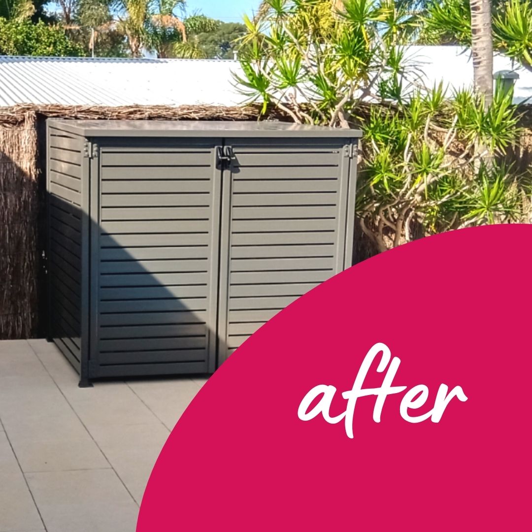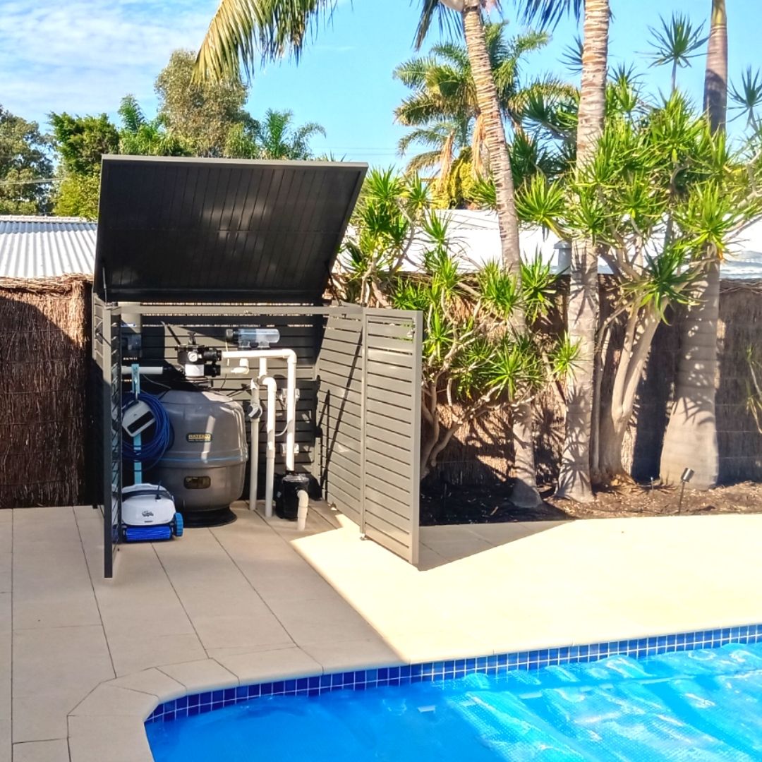 This install features a Free Standing Pool Pump Cover powdercoated in Colorbond Woodland Grey. At 1240mm deep x 1485mm high x 1600mm wide, this pool shed provides plenty of extra storage space for all of the home owner’s pool gear, which is super easy to get to via the double gates and gas-lift lid.